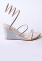 This design is elevated with an all-over rhinestone embellishment that catches the light with every step, creating a magnetic and refined touch. The wedge heel is also fully adorned with shimmering crystals, adding to the shoe's luxurious appeal. The sandals are designed for both style and comfort, featuring a cushioned footbed for a comfortable feel, even on uneven surfaces.Â